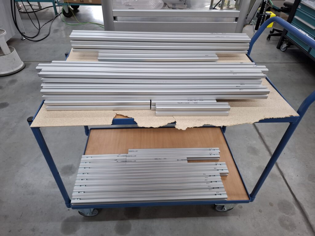 Am Sonntag haben wir bei schlechtem Regenwetter mit dem Zuschnitt der Aluminiumprofile für die Rahmenkonstruktion der E-Winde begonnen. Bald geht es weiter.